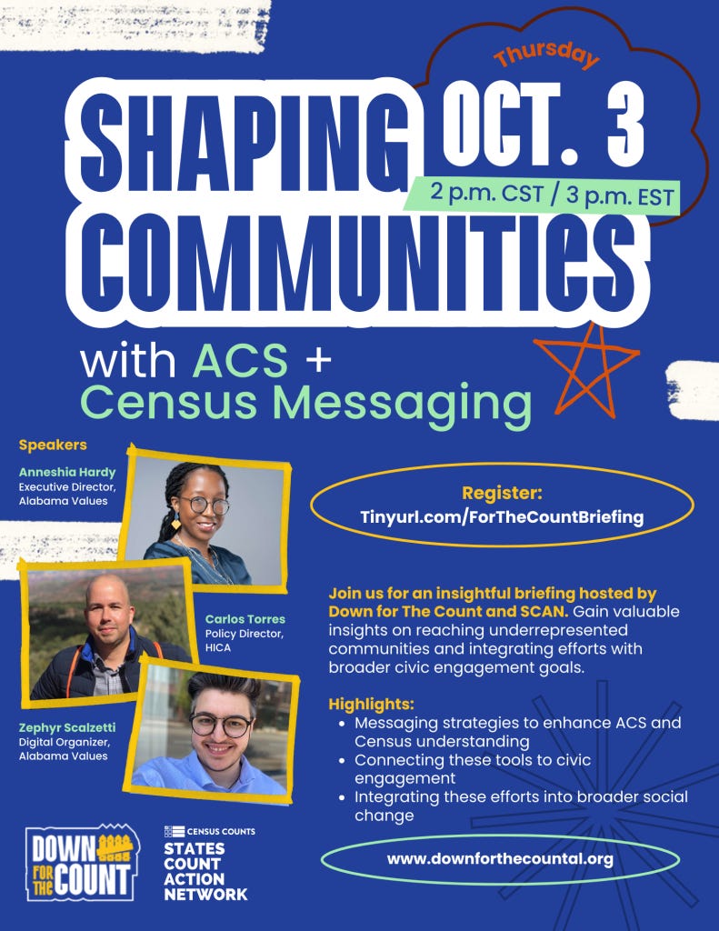 Down For The Count is dedicated to ensuring every voice in Alabama is heard and every community is counted—and understands that it takes a collective effort to accomplish this mission. Alabama residents interested in learning more can hear from Down For The Count partners Alabama Values and HICA at the Shaping Communities virtual briefing in partnership with States Count Action Network on Thursday, October 3rd, at 2pm. People who plan to attend must register beforehand.